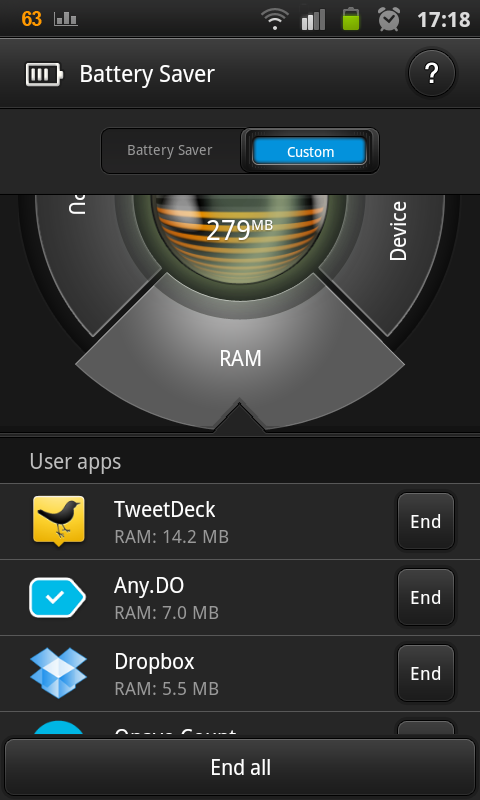 Aplicatia se comporta si ca un Task Manager, aratand cata memorie si cat la suta din procesor consuma fiecare proces in parte. Incepand cu versiunea 1.3, in zona de Task Manager a aparut si butonul de End all, pentru o eliberare rapida a resurselor telefonului.