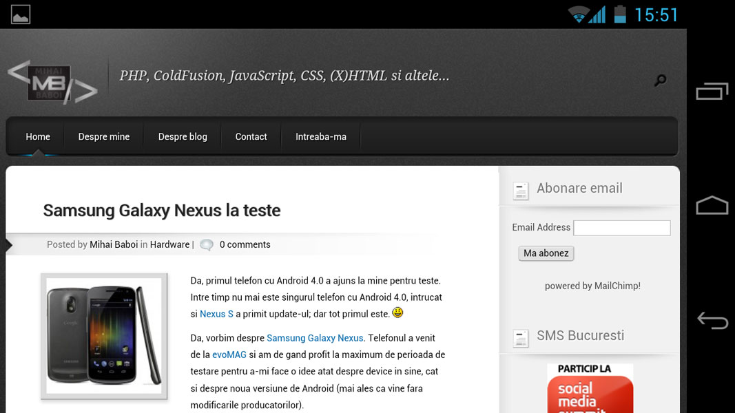 Magazinul evoMAG mi-a pus la dispozitie unul din cele mai cautate telefoane mobile ale momentului: Samsung Galaxy Nexus. Primul telefon (si singurul la vremea lansarii) care a venit echipat cu sistemul de operare Android 4.0 Ice Cream Sandwich.