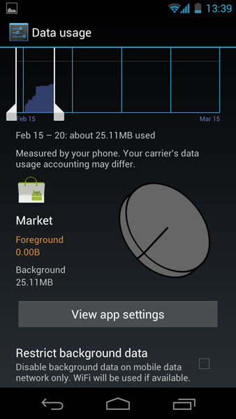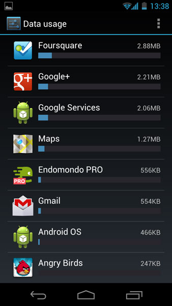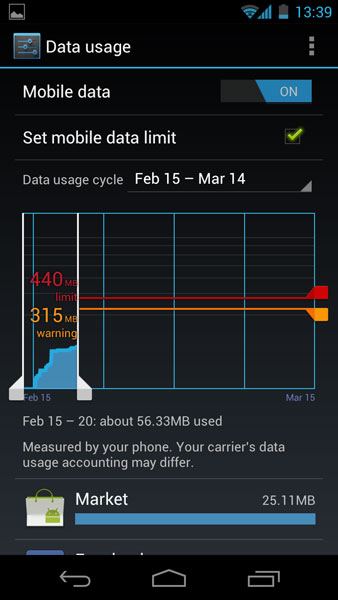 Nu pot sa vorbesc despre Android 4.0 fara sa mentionez managerul de date. Galaxy Nexus nu numai ca vine cu o aplicatie nativa care sa monitorizeze consumul de trafic. Stie sa raporteze ce aplicatii fac cel mai mult trafic si sa puna avertizari si limitari generale si individuale dincolo de anumite limite. Mie mi s-a parut unul din cele mai mari progrese pe care le aduce acest sistem de operare.