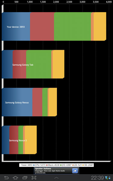In Quadrant, Galaxy Tab 7.7 s-a comportat foarte bine, cel mai bun scor obtinut fiind de aproape 4000 de puncte; 3893, mai exact. E unul din cele mai bune scoruri pe care le-am vazut pe un device cu Android, asa ca eu ma declar multumit.