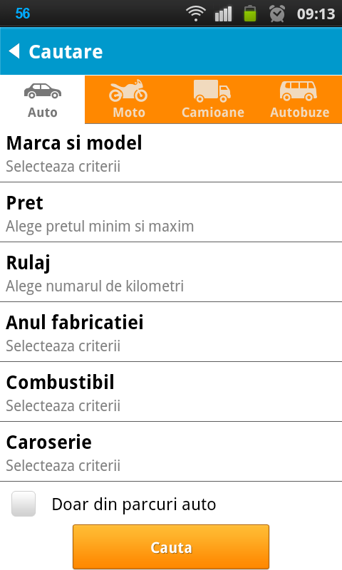 Urmeaza vechile module (cele care existau si inainte). De fapt, daca e sa fiu sincer, nu mai stiu daca in vechea aplicatie se puteau adauga anunturi; dar sunt sigur ca exista un modul de cautare. In orice caz, acesta a primit un upgrade din punct de vedere al aspectului si ergonomiei. In plus, acum iti poti salva cautarile si poti adauga notificari mult mai eficient.