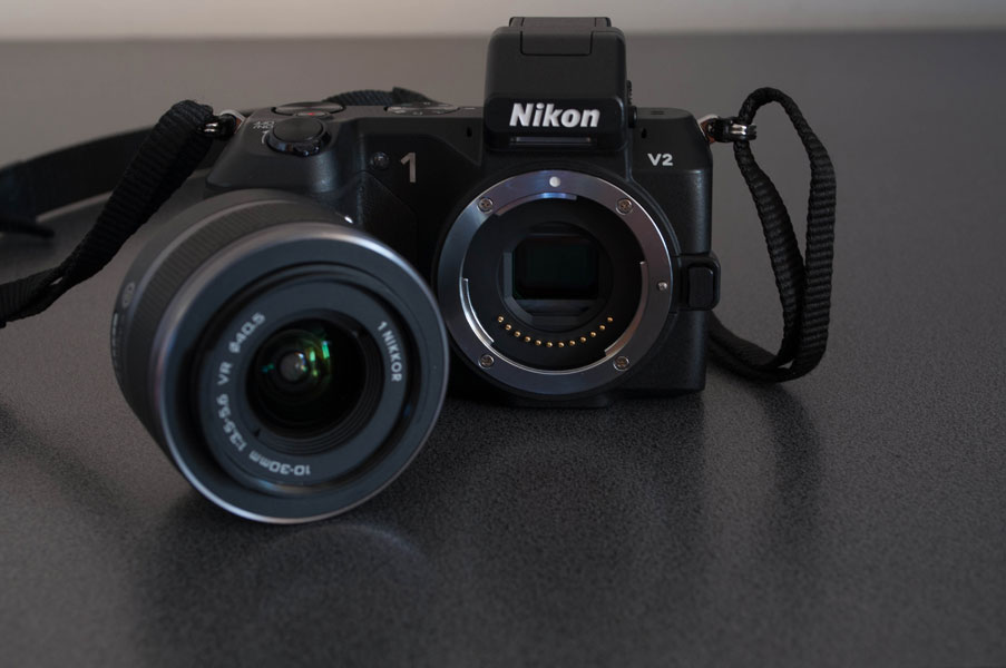 La fel ca si modelul 1 V1, Nikon 1 V2 vine cu un obiectiv de kit destul de deosebit. Cel mai important lucru pe care il putem observa la el este butonl de On/Off care controleaza chiar starea aparatului foto.